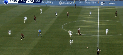 ↑33:15,边路萨勒马克尔斯和托莫里把萨索洛的防守吸引在边路,莫德里奇的前移接球就让本来负责盯防齐克的坎德处于顾此失彼的状态(索斯特维德没有及时横移)。利用魔笛的传球以及齐克这一点在肋部的接应,就打穿了萨索洛整条防线的布置,随后的事大家就都知道了。
